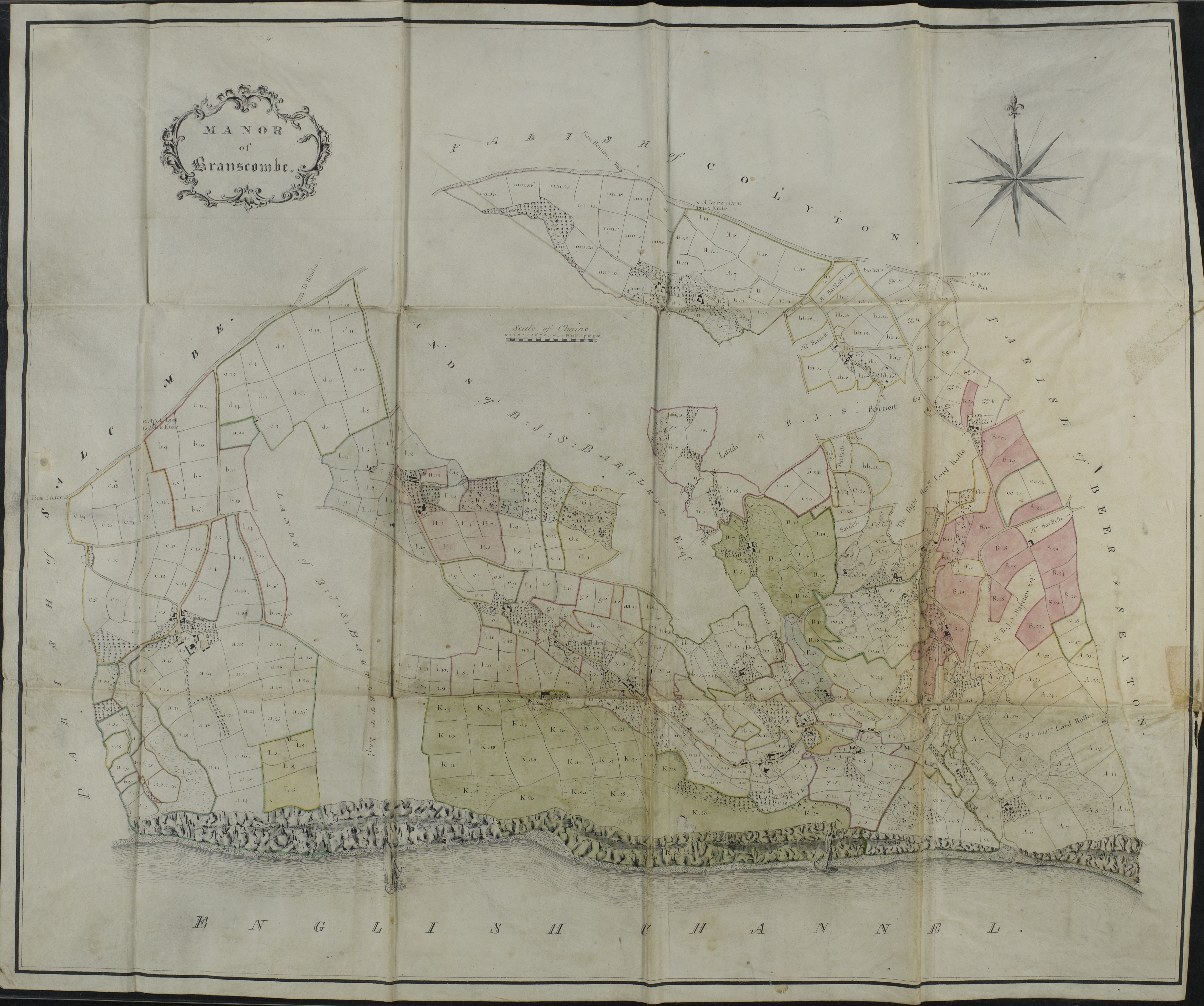 The map, entitled ‘Manor of Branscombe’, was drawn up by Messrs Bradley and Summers of Taunton in 1810, for Barnaby John Stuckey Bartlett and Vincent Stuckey. They were the co-